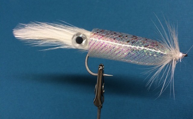 Tail: White buck tail support; White saddle hackle; 2 strands each pearl and gold flashabou; Chartreuse saddle hackle